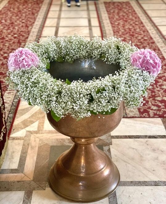 Ghirlanda din floarea miresei pentru cristelnita de botez.