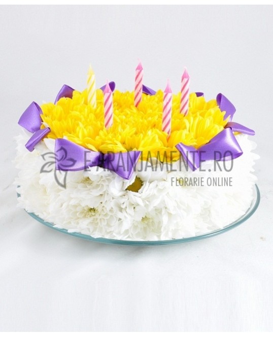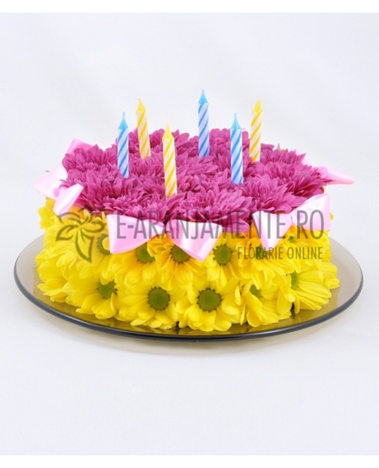 Aranjament floral in forma de tort din flori cu crizanteme si margarete, in diferse combinatii de culori la alegere. Se livreaza cu lumanari de tort, in cutie de tort. Nu este comestibil.