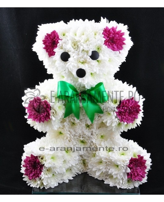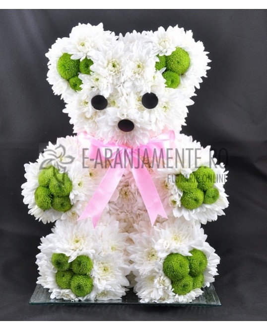 Ursulet din flori, realizat din crizanteme albe si santini verde. Culorile se pot modifica usor, in functie de cerinte si stoc. Ursuletul din flori este un aranjament floral potrivit pentru un cadou de nou nascut, botez sau ca un gest romantic. Livrarea in Bucuresti este gratuită.